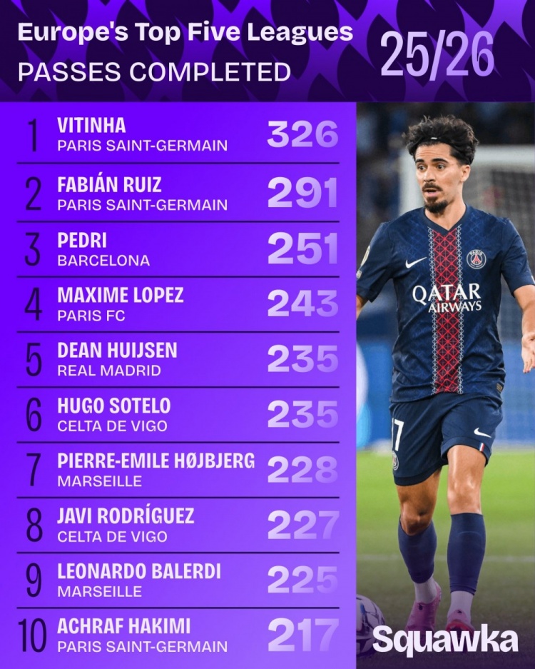 本赛季五大联赛成功传球次数榜:维蒂尼亚、法比安、佩德里前三